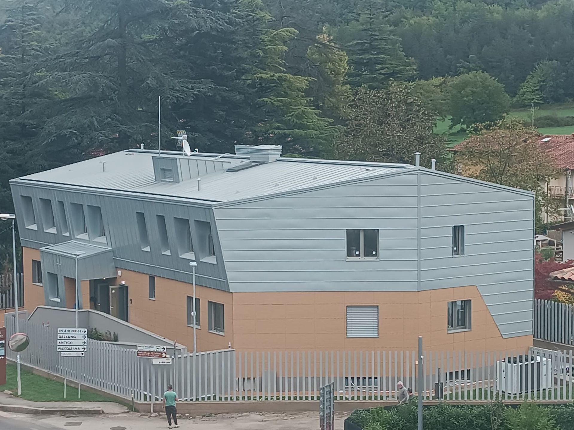 Rivestimento della copertura e parte della facciata in zinco-titanio prepatinato grigio e la parte bassa in HPL sp 8 mm